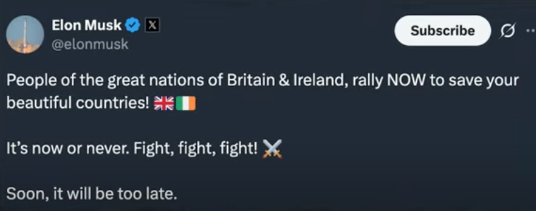 머스크는 웨일스 거리에 웨일스 국기를 거는 동영상을 리트윗하면서 "위대한 나라 영국과 아일랜드 국민들은 '지금' 당신들의 아름다운 나라를 구하기 위해 일어나라. 지금 나서야지 나중은 없다. 싸워라, 싸워라, 싸워라! 곧 너무 늦는 날이 올 것이다."라고 썼다.