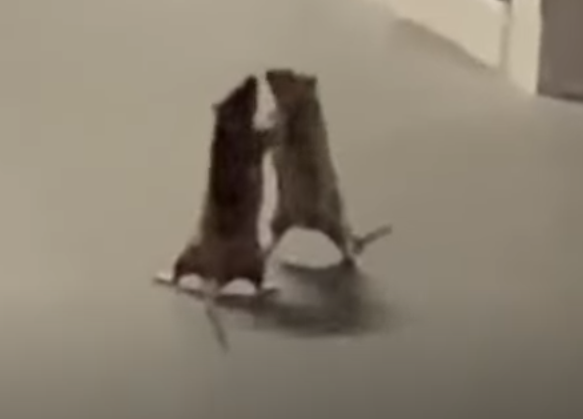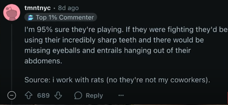 나는 95% 확신하는데, 쟤네는 그냥 노는 거야. 만약 싸웠다면 엄청 날카로운 이빨을 썼을 거고, 눈알이 뽑혀 있거나 내장이 배에서 튀어나와 있었을 거야. 출처: 나는 쥐들과 함께 일해(쟤들은 내 직장 동료가 아님).