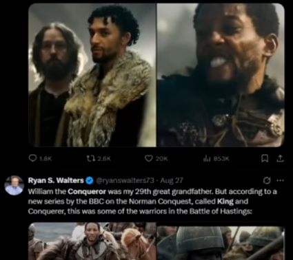 또 최근 방영되고 있는 BBC의 역사 드라마 <King & Conqueror(왕과 정복자)>에 흑인 배우들이 11세기 앵글로색슨 전사로 등장해 시청자들로부터 역사 왜곡이란 반발을 사고 있다.