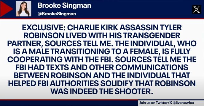단독 보도: 찰리 커크의 암살범 타일러 로빈슨은 그의 트랜스젠더 파트너와 함께 살고 있었다고 소식통이 전했다. 해당 인물은 남성에서 여성으로 성별 전환 중이며, FBI와 전적으로 협조하고 있다. 소식통에 따르면 FBI는 로빈슨과 이 인물 사이의 문자와 기타 통신 기록을 확보했으며, 이 증거들이 로빈슨이 실제 범인임을 확정하는 데 도움을 주었다.