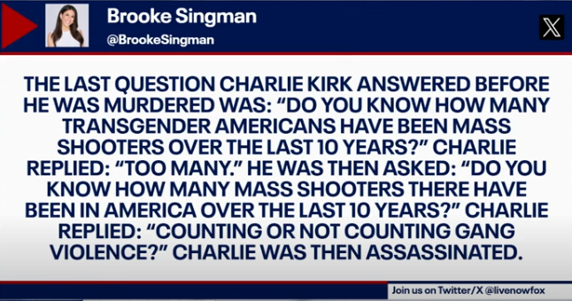 찰리 커크가 암살되기 직전에 받은 마지막 질문은 다음과 같다: “지난 10년간 미국에서 트랜스젠더 미국인 중 몇 명이 총기 난사범이었는지 아십니까?” 찰리는 “너무 많습니다”라고 답했다. 이어 그는 “지난 10년간 미국에서 총기 난사범이 총 몇 명이었는지 아십니까?”라는 질문을 받았다. 찰리는 “갱단 폭력을 포함하느냐, 포함하지 않느냐에 따라 다릅니다”라고 답했고, 그 직후 암살당했다.