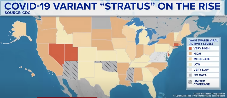 이번에 유행하는 코로나는 XFG 변이로, 스트라투스(Stratus)라고 불린다. 그동안 미국에서는 NB.1.8.1(님버스 Nimbus) 변이가 지배적이었지만, 스트라투스가 뛰어난 면역 회피력을 통해 우세종으로 자리잡았다.