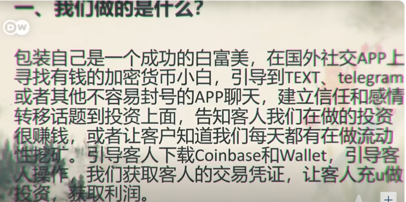 로라는 서구 국가에서 이민 온 중국계였습니다. 얼마 지나지 않아 캘리포니아 출신이라는 남자는 “우리에겐 이런 암호화폐가 있다”고 말했습니다. 암호화폐는 비트코인처럼 투자 수단으로 인기가 높아지고 있지만, 위험이 큰 만큼 이익도 큽니다. 규제가 비교적 느슨하고 거래 추적이 어렵기 때문에 조직범죄에 매력적입니다. 로라는 그 사람을 믿고 암호화폐를 배우기로 했습니다. 웹사이트에 투자하면 투자금이 얼마인지 볼 수 있고 인출도 할 수 있다고 했습니다.