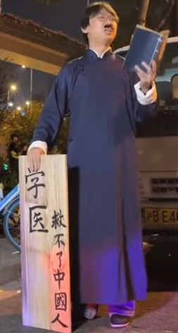 작가 루쉰으로 분장한 청년은 '의학이 중국인을 살리지 못한다'라는 루쉰의 말을 인용했다. 즉 중국인에게 필요한 것은 신체적 건강이 아닌 정신적 자유임을 표현한 것이다.