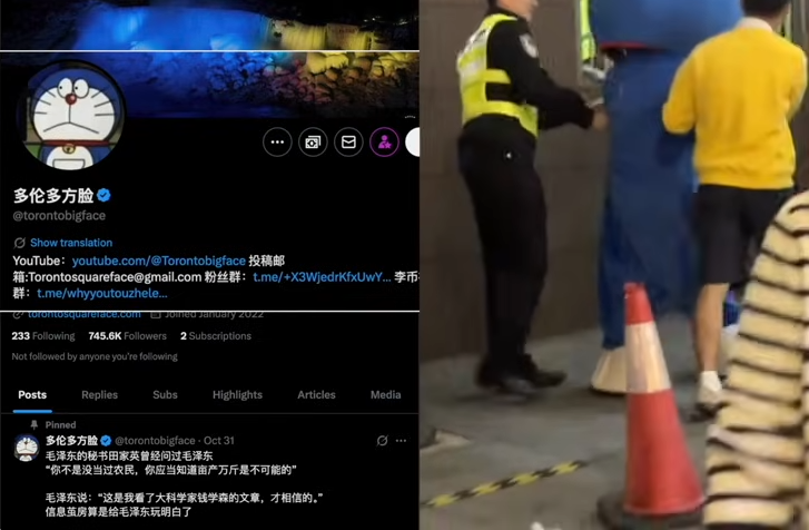 상하이 번화가에서 도라에몽과 우유로 분장한 사람들이 체포됐다. 이에 대해 “위대한 당과 위대한 정부가 우유팩과 고양이 같은 것조차 두려워하다니 놀랍다.", "반 CCP 인물인 토론토빅페이스(torontobigface) 분장을 한 듯하다. 그의 프로필 사진이 도라에몽이다"라는 반응이 나왔다. 또 APEC 미중정상회담 후 시진핑이 침묵한 것처럼 모든 국민에게 침묵을 강요한다는 비판도 나왔다.