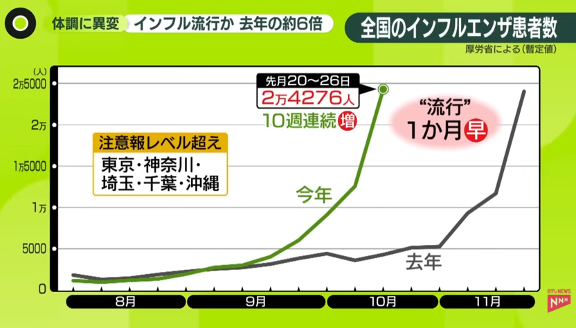 지난달 20~26일 일본의 독감 환자는 2만4000여 명으로 지난해 같은 기간보다 6배 많은 것으로 집계됐다. 독감 유행 시기는 지난해보다 한 달 빨라졌다.
