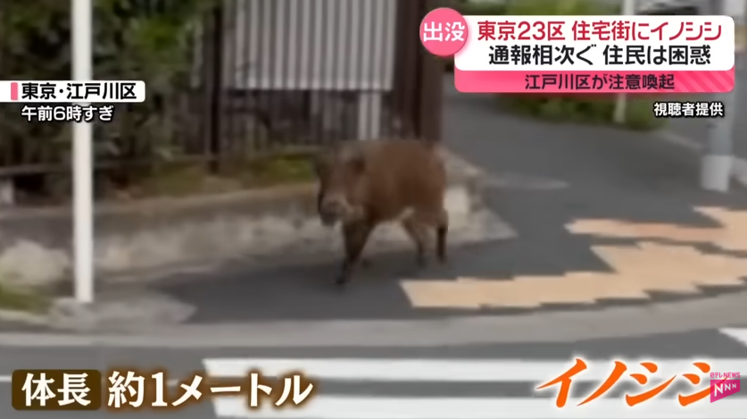 4일 아침 몸길이 1미터 가량의 멧돼지 한 마리가 도쿄 23구 주택가를 달리는 모습이 목격됐다고 ntv가 5일 보도했다.