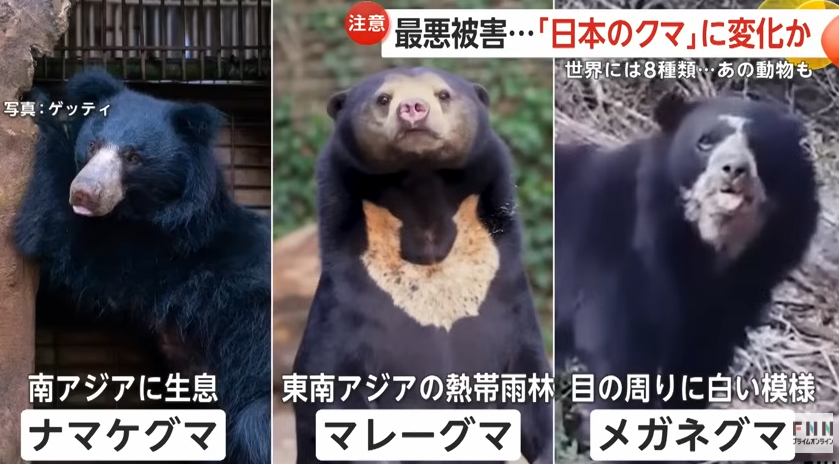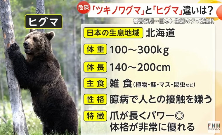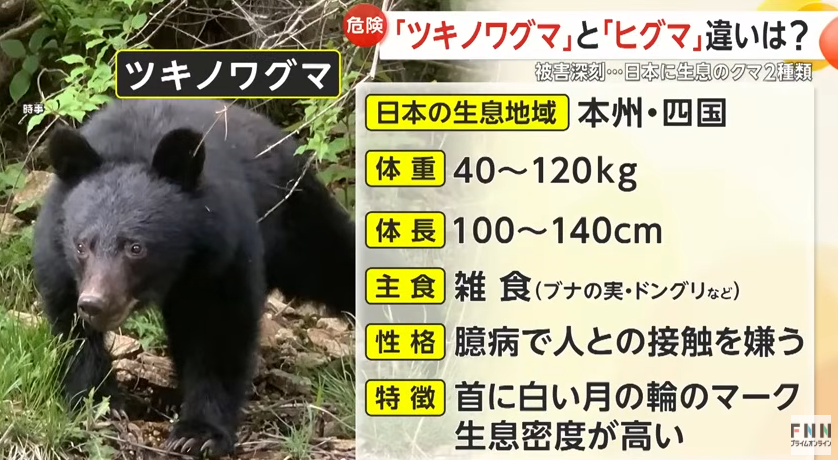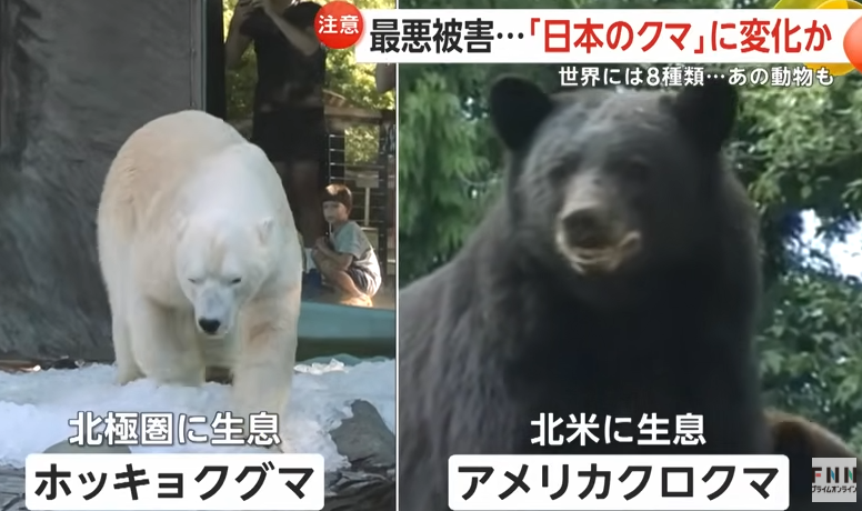 불곰은 홋카이도에만 산다. 반달가슴곰은 혼슈(도쿄, 오사카 등이 있는 최대 섬)와 시코쿠에 서식한다.