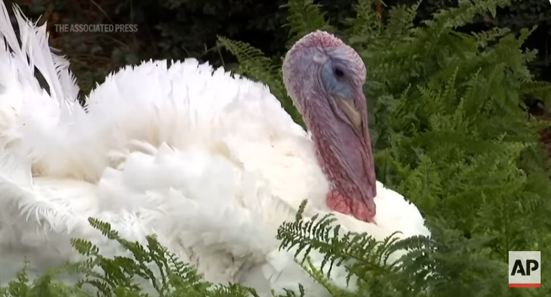 오늘 우리는 미국의 오래된 전통을 이어갑니다. 와, 정말 훈련이 잘된 칠면조네요. 저 표정 좀 보세요, 얼마나 행복한지!