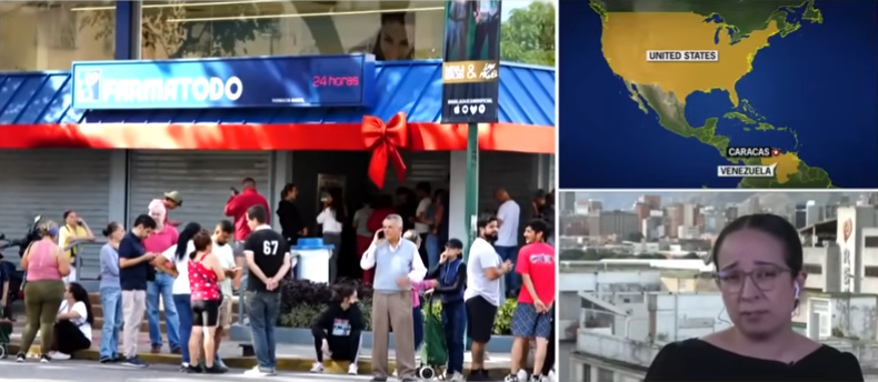 마두로 체포·이송 직후의 카라카스 시내. 많은 상점들이 문을 닫은 가운데 시민들이 문을 연 식품점 앞에서 길게 줄을 선 모습을 볼 수 있다.