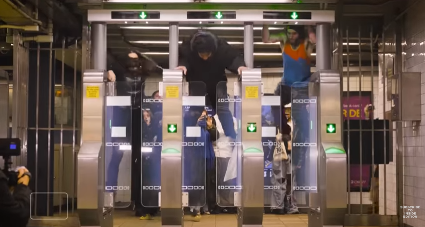 이 그룹은 무임승차를 극단적으로까지 끌어올립니다. 한 명씩 배를 바닥에 대고 게이트 아래로 기어갑니다. 그리고 요금을 피하기 위해 이 남자는 재킷을 센서 위에 던져 문이 닫히지 않게 한 뒤, 모두가 그대로 통과합니다.