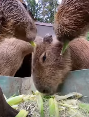일본 동물원에 사는 카피바라들이 옥수수를 먹는데요. 알맹이는 없고 껍질만 있는 것 같은데 맛있게 먹네요.